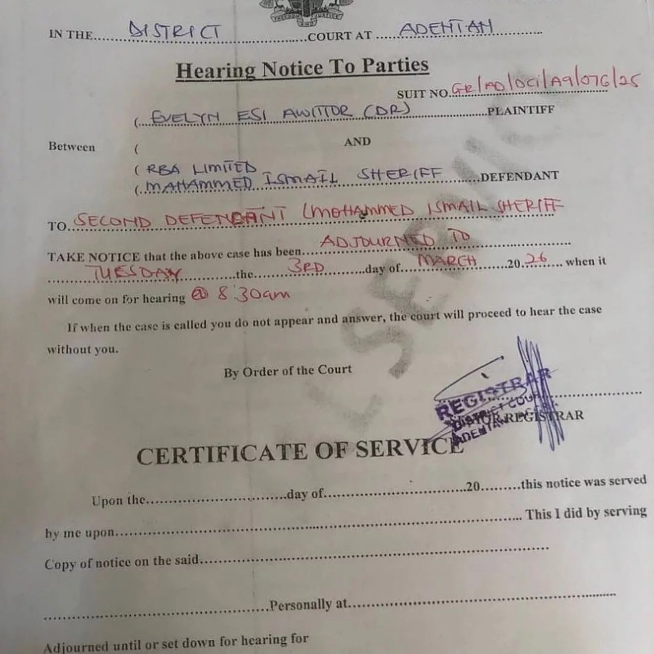 Following his absence, the court ordered that, documents of the lawsuit be pasted at his house to ensure that the message is delivered to him.