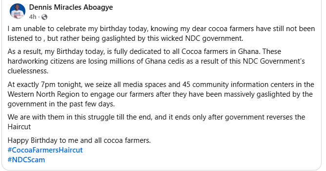“I am unable to celebrate my birthday today, knowing my dear cocoa farmers have still not been listened to, but rather being gaslighted by this wicked NDC government,” he said.