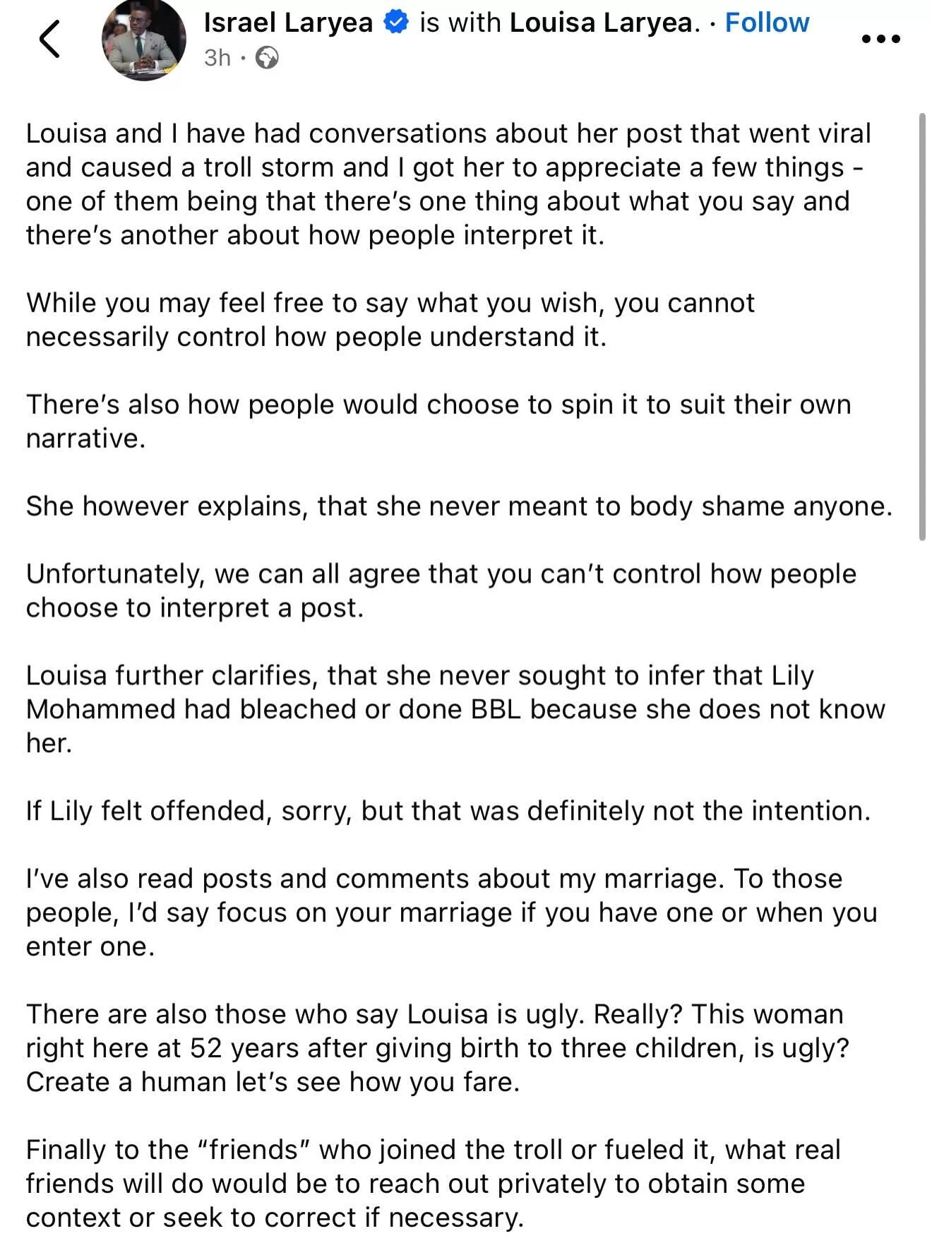 Israel Laryea took to his official Facebook page to post a picture of his wife, and via the caption, address brouhaha that revolved around his wife, Louisa Laryea.