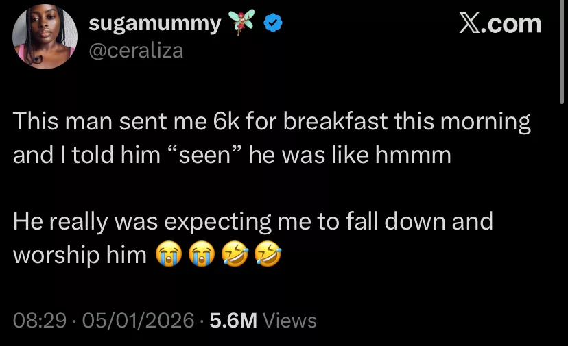 “This man sent me 6k for breakfast this morning, and I told him ‘seen’. He was like ‘hmmm’. He really was expecting me to fall down and worship him.”